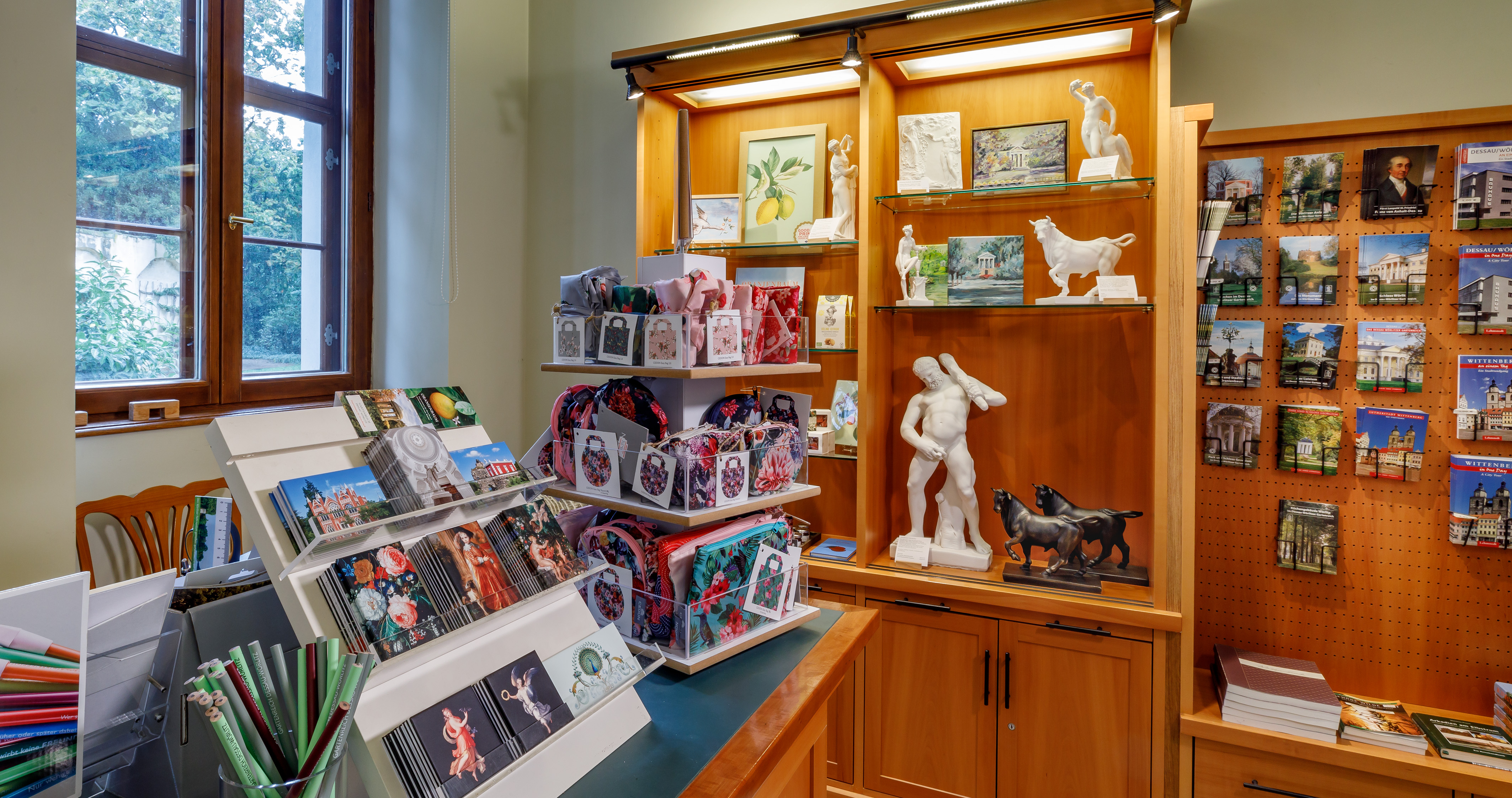 Neben Geschenkartikeln rund um die Themen Natur und Garten finden Sie in den Shops unserer Schlösser viele maßgeschneiderte Gartenreich-Andenken in den Regalen. Darunter sind die beliebten Gipsabgüsse der Skulpturen aus den Schlössern, neue Postkarten, Bleistifte, Magnete, Notizhefte, -bücher und -blöcke, Portfoliomappen, Untersetzer oder Schals. Aus den unzähligen „unendlich schönen“ Bildmotiven der Gartenreich-Schlösser und Parks haben wir für die Gestaltung der Artikel die charmantesten Ansichten und Detailaufnahmen ausgewählt. Jeder kann sich nun ein Stück Gartenreich mit nach Hause nehmen – denn für jedes Budget ist etwas Passendes dabei. Selbstverständlich können Sie in den gartenreichläden auch die Eintrittskarten für unsere Häuser kaufen.