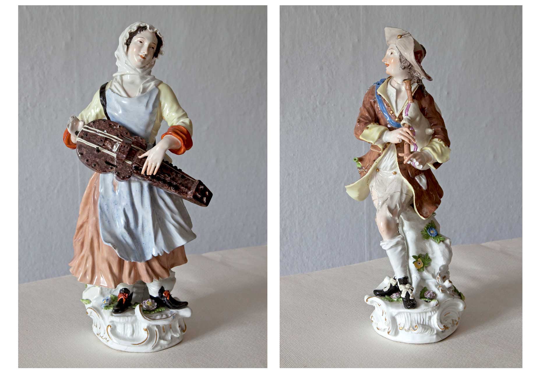 Die Porzellanfiguren eines Dudelsackpfeifers und einer Drehleierspielerin gehören zum Altbestand des Rokoko-Schlosses Mosigkau aus den frühen Jahren nach der Erbauung (1752 bis 1757).